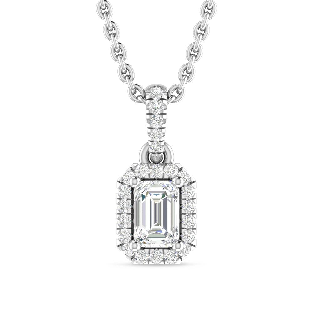 1 1/20 ctw Emerald Cut Diamond Halo Pendant With Cascading Bail Accents In 14K White Gold