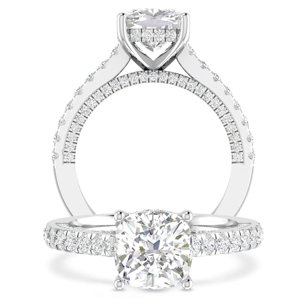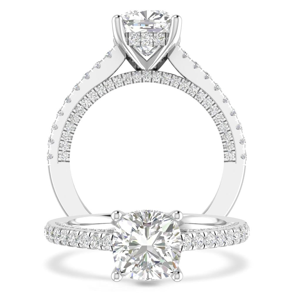 Glamorous 3 1/10 ct Cushion-Cut Solitaire Diamond Bridal Set In 14K White Gold Diamond Accented Wedding Band & Hidden Halo