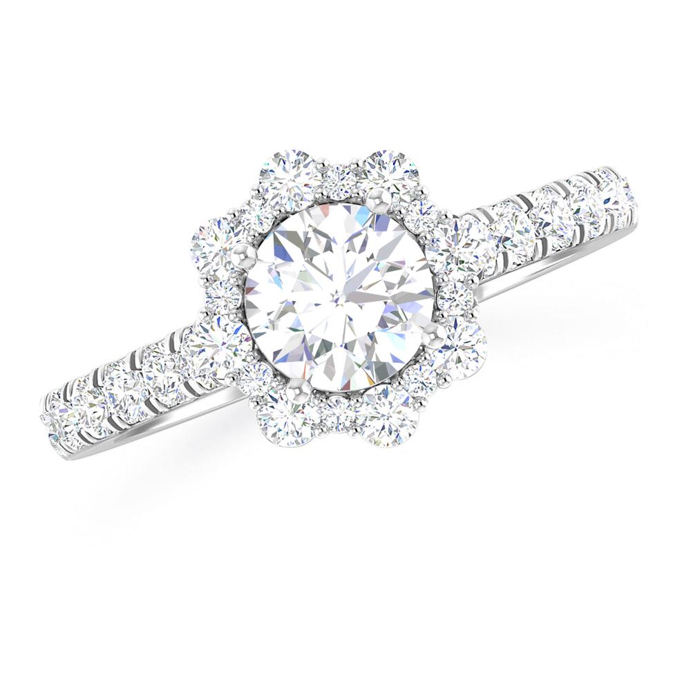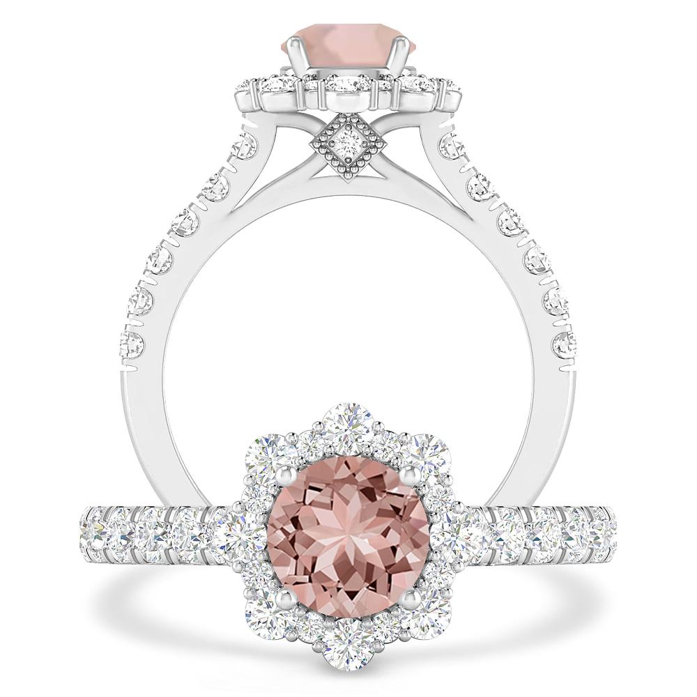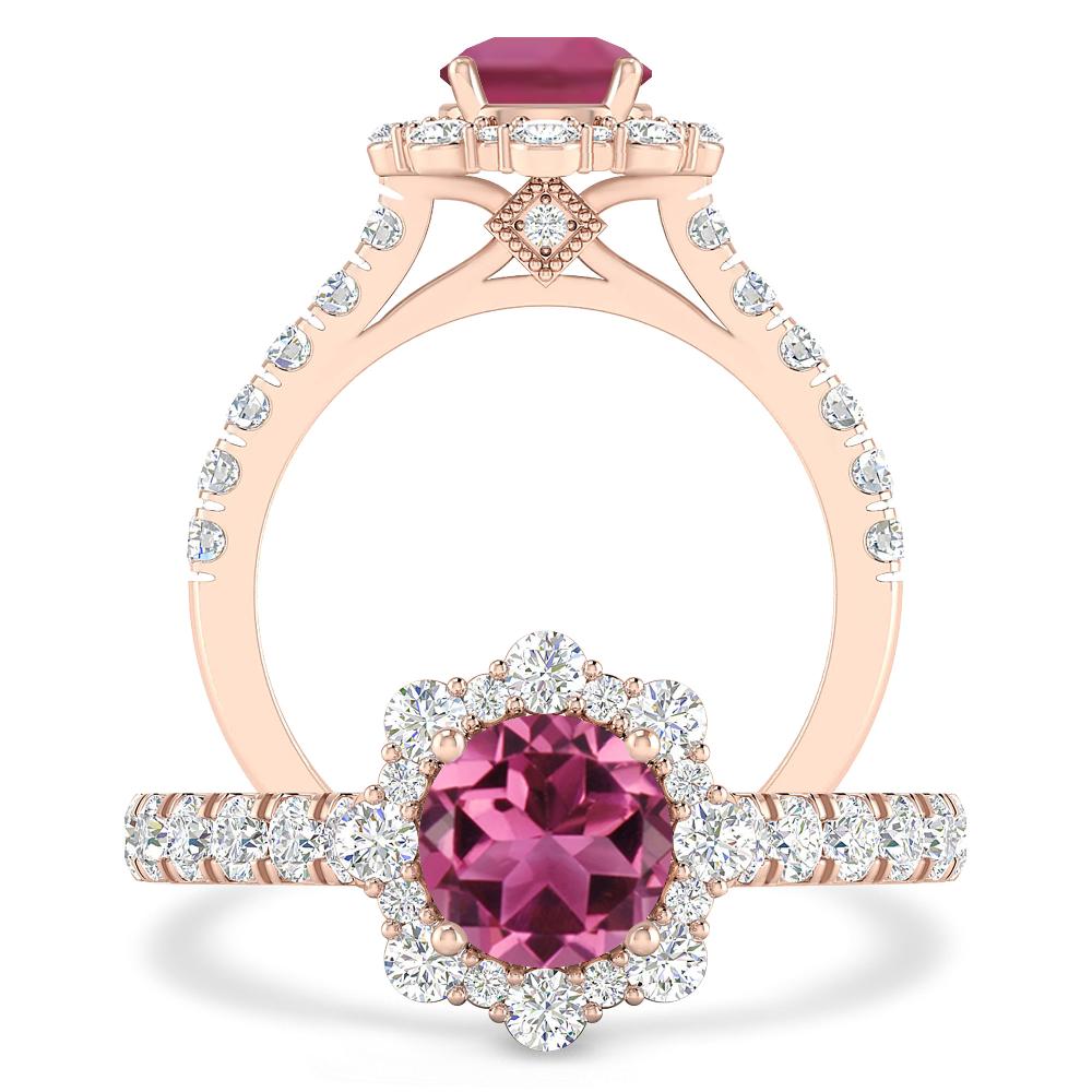 1 7/8 ctw Round Lab Grown Pink Tourmaline Floral Halo Engagement Ring With Diamond Accented Shank In 14K White Gold